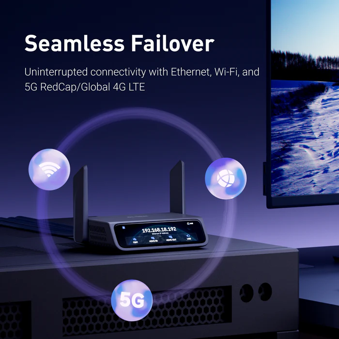 • Multi-network auto-failover: Ethernet → Wi-Fi → 5G/4G when the primary path fails