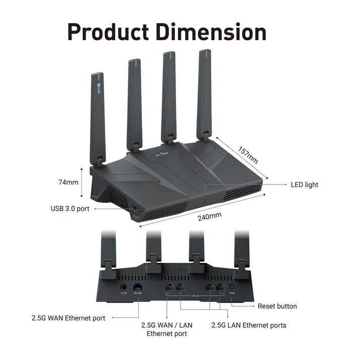 Flint 3e (GL-BE6500) targets next-gen speed, stability, and security for smart homes, SOHO, and busy households: dual-band Wi-Fi 7 with MLO, up to roughly 6.5 Gbps aggregate wireless performance in AFI WIRELESS marketing, about 2,500 sq. ft. coverage, 100+ concurrent clients, and five 2.5G Ethernet ports with multi-WAN options.