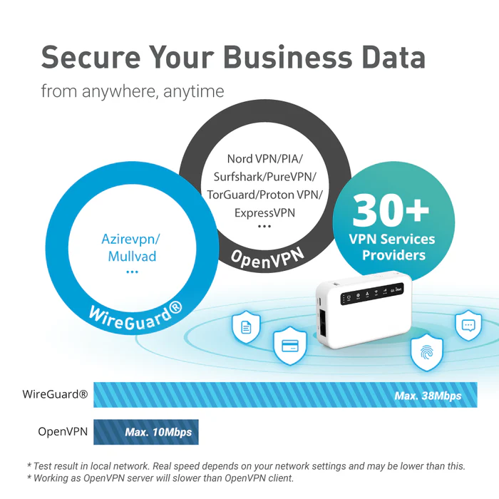 Along with firewall protections, Puli supports OpenVPN, WireGuard, and custom DNS settings. You can configure both VPN client and server behavior from AFI WIRELESS Web UI 3.0.
